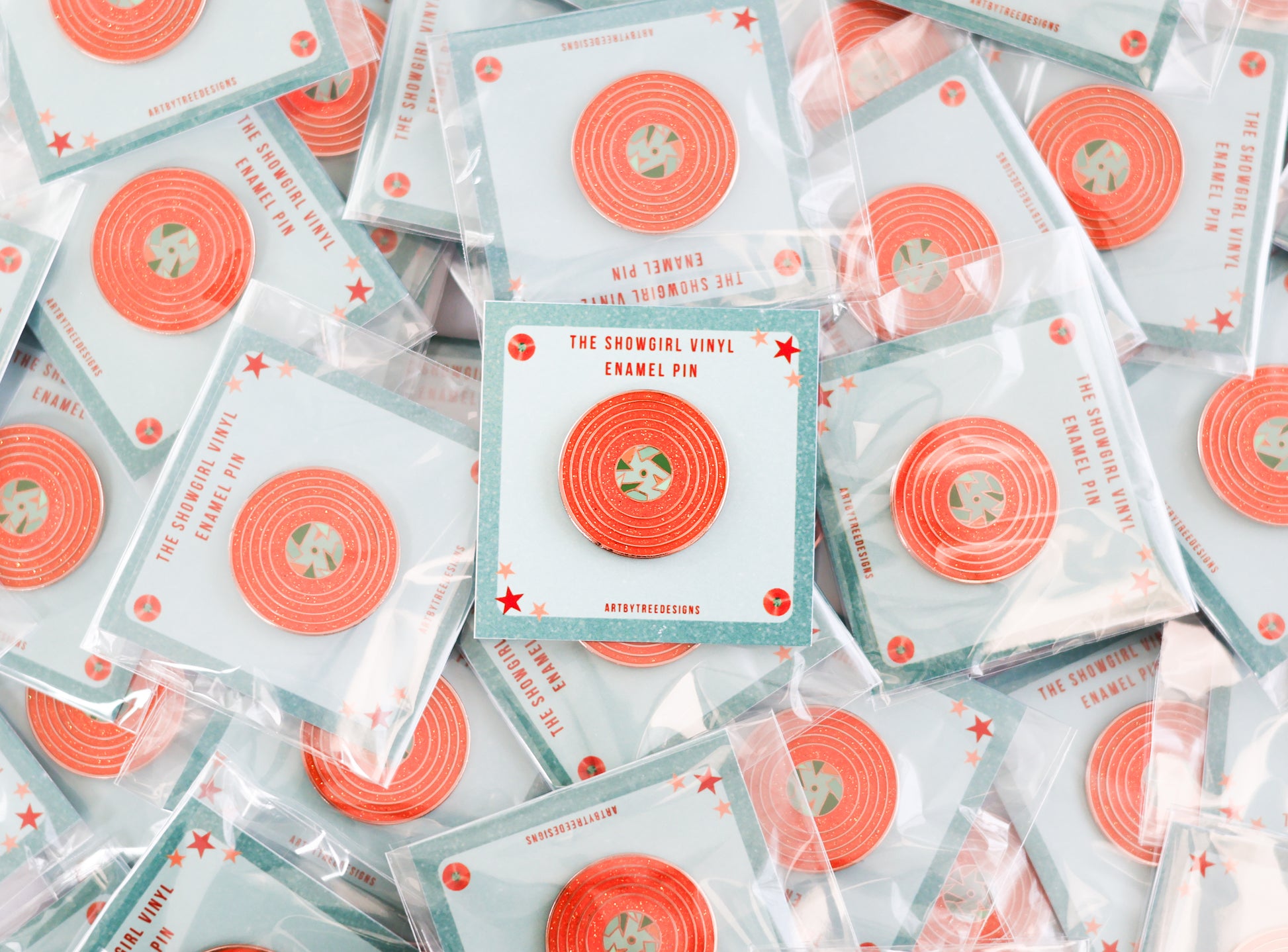 Decorate your backpacks, lanyards, or any kind of display with this Showgirl themed enamel pin!